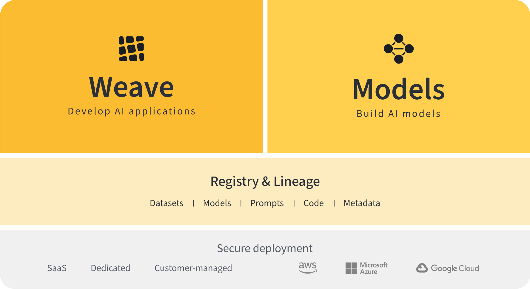 W&B 는 다음 세 가지 주요 구성 요소로 이루어져 있습니다: Models, Weave, 그리고 Core:
