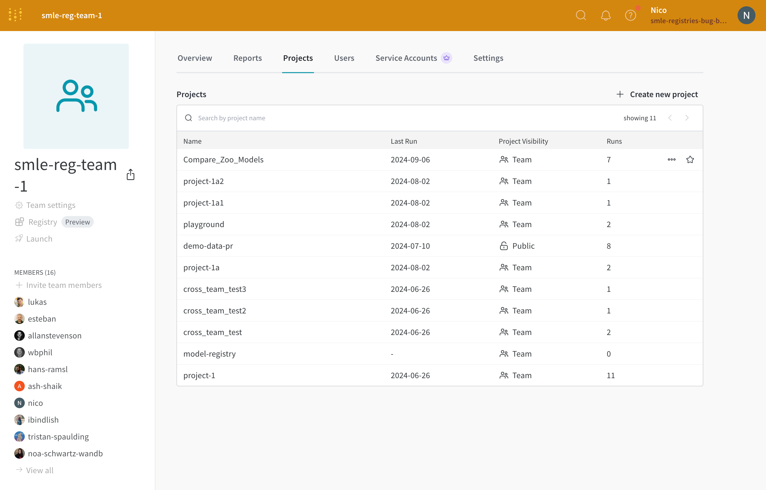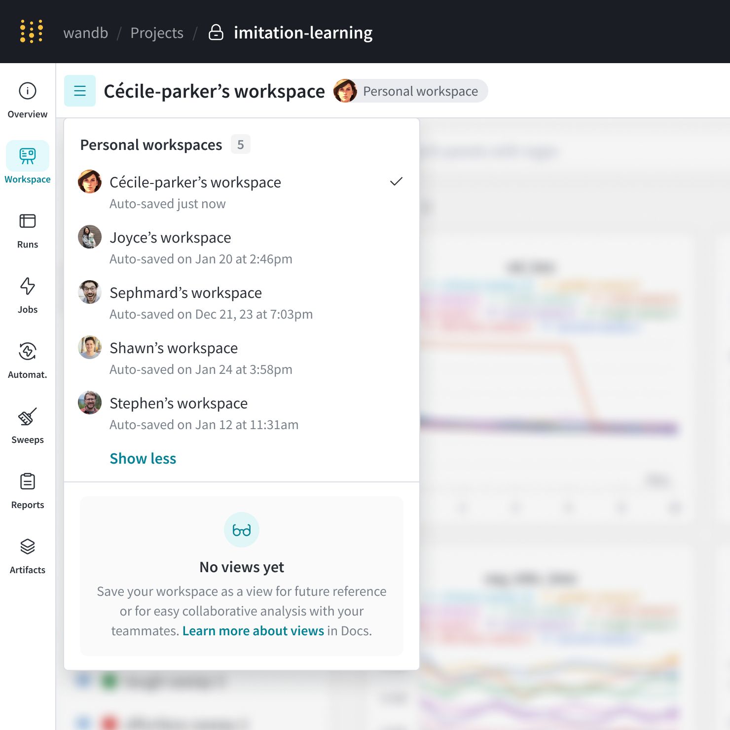 프로젝트의 workspace는 실험을 비교할 수 있는 개인 샌드박스를 제공합니다. 프로젝트를 사용하여 다양한 아키텍처, 하이퍼파라미터, 데이터셋, 전처리 등으로 동일한 문제에 대해 작업하면서 비교할 수 있는 Models를 구성합니다.