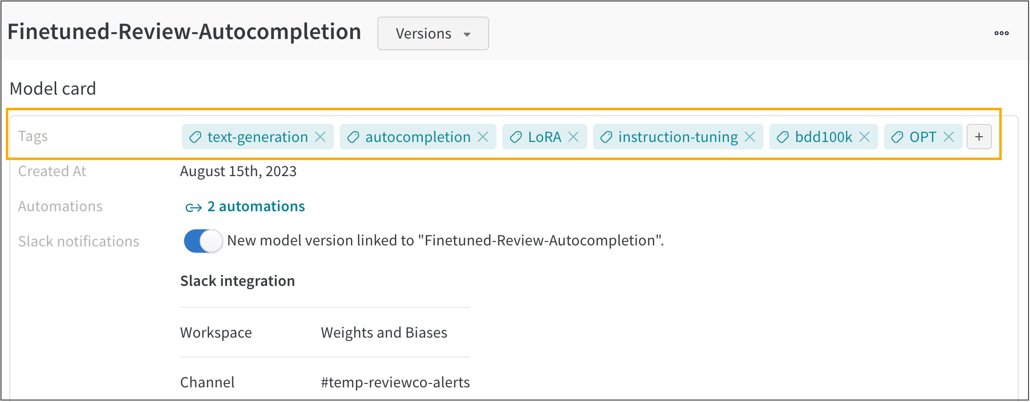 Overview 패널에서는 아티팩트 이름과 버전, 변경 사항을 감지하고 중복을 방지하는 데 사용되는 해시 다이제스트, 생성 날짜, 에일리어스를 포함하여 아티팩트에 대한 다양한 고급 정보를 찾을 수 있습니다. 여기서 에일리어스를 추가하거나 제거하고 버전과 아티팩트 전체에 대한 메모를 작성할 수 있습니다.