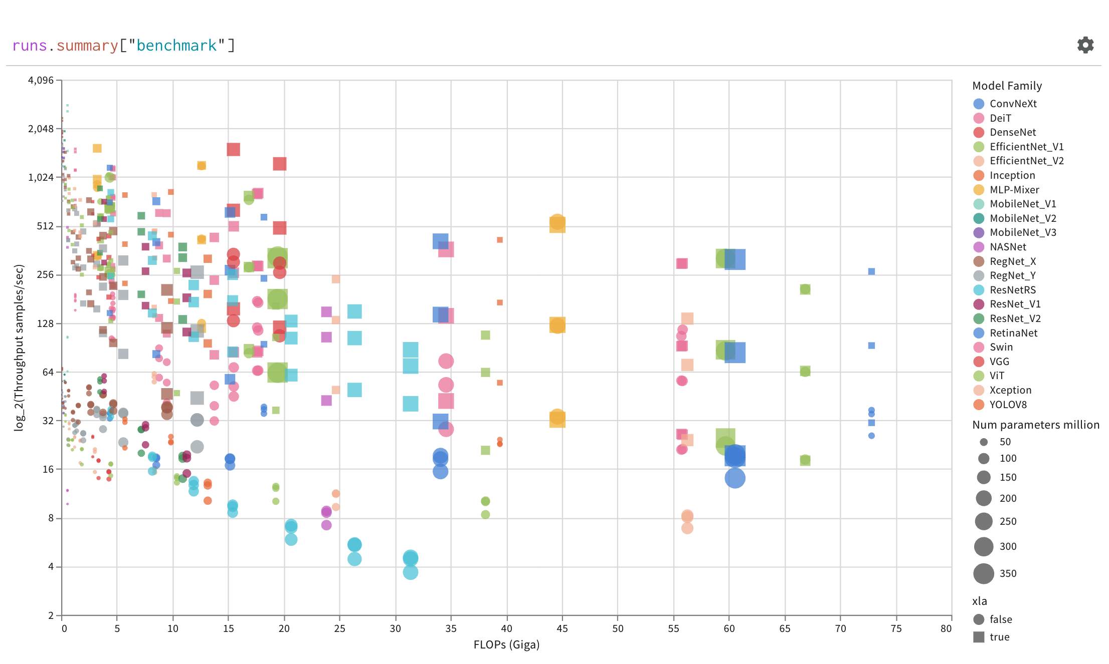 Group: 아키텍처별로 Runs을 동적으로 그룹화할 구성 열을 선택합니다. 그룹화하면 플롯에 평균 값을 따라 선이 표시되고 그래프에서 점의 분산에 대한 음영 영역이 표시됩니다.