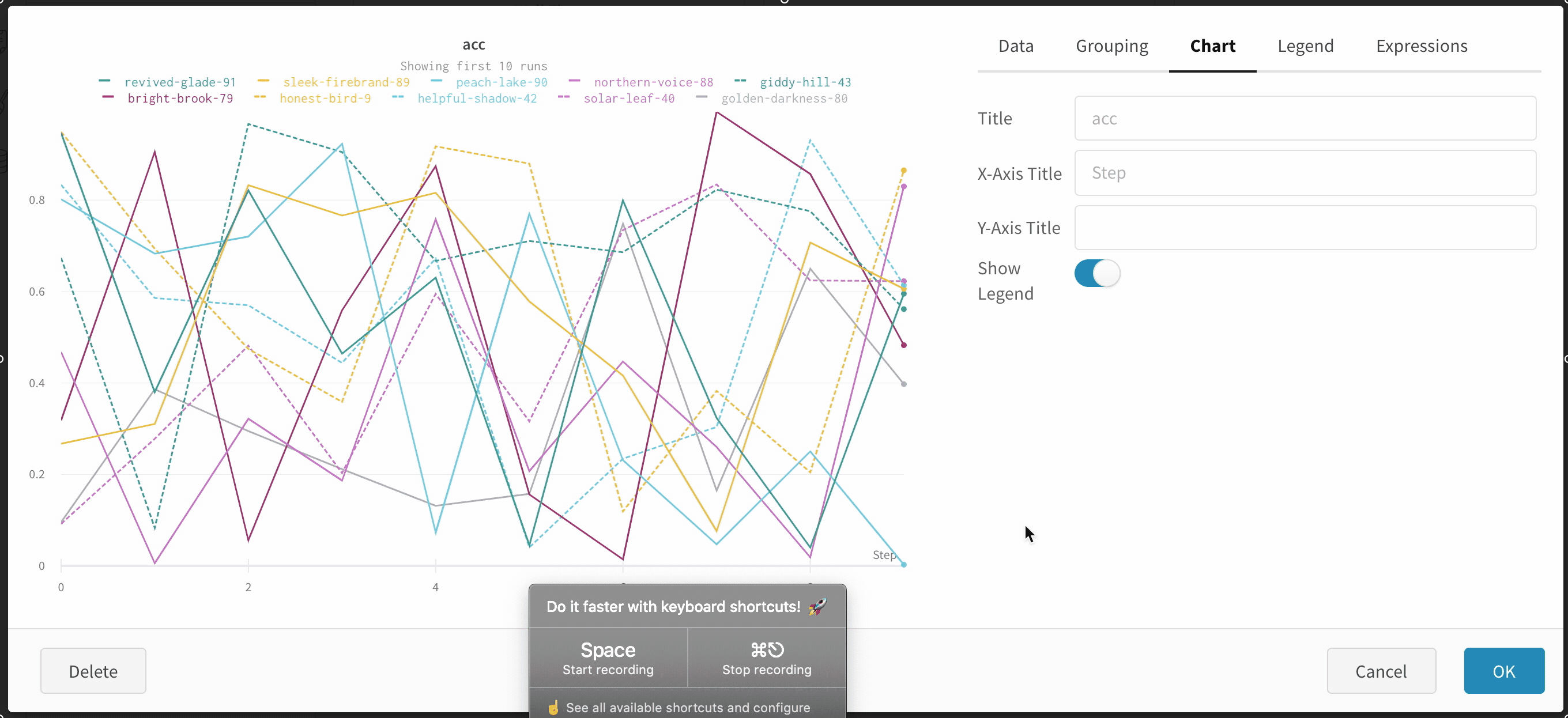 • X: X축에 사용할 값을 선택합니다 (기본값은 Step). x축을 Relative Time으로 변경하거나 W&B로 기록하는 값을 기반으로 사용자 정의 축을 선택할 수 있습니다.