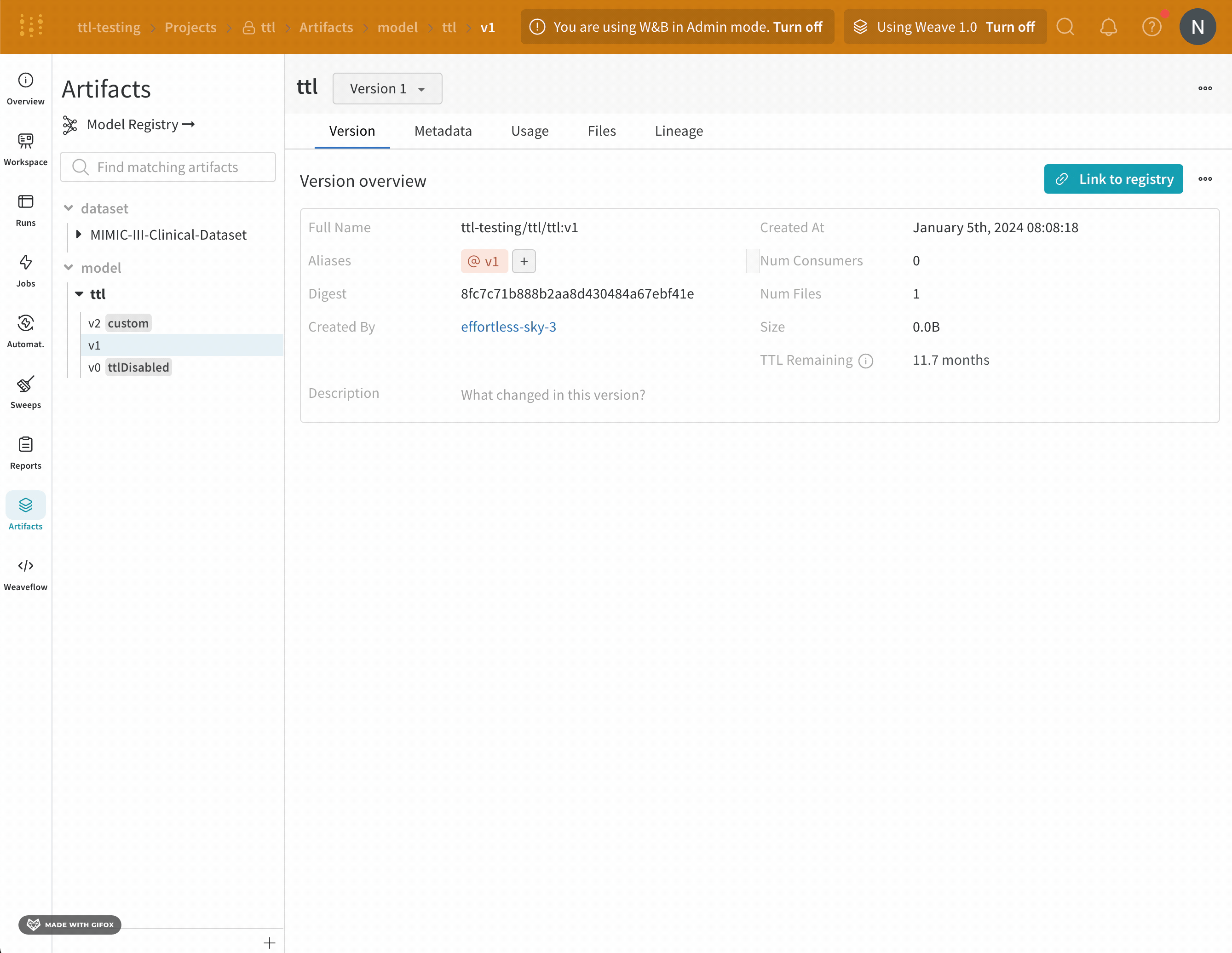 W&B App UI를 사용하여 아티팩트에 대한 TTL 정책을 봅니다.