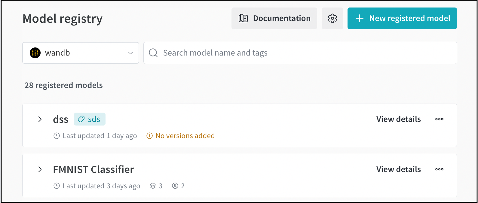 - https://wandb.ai/registry/model의 W&B Model Registry 앱으로 이동합니다.