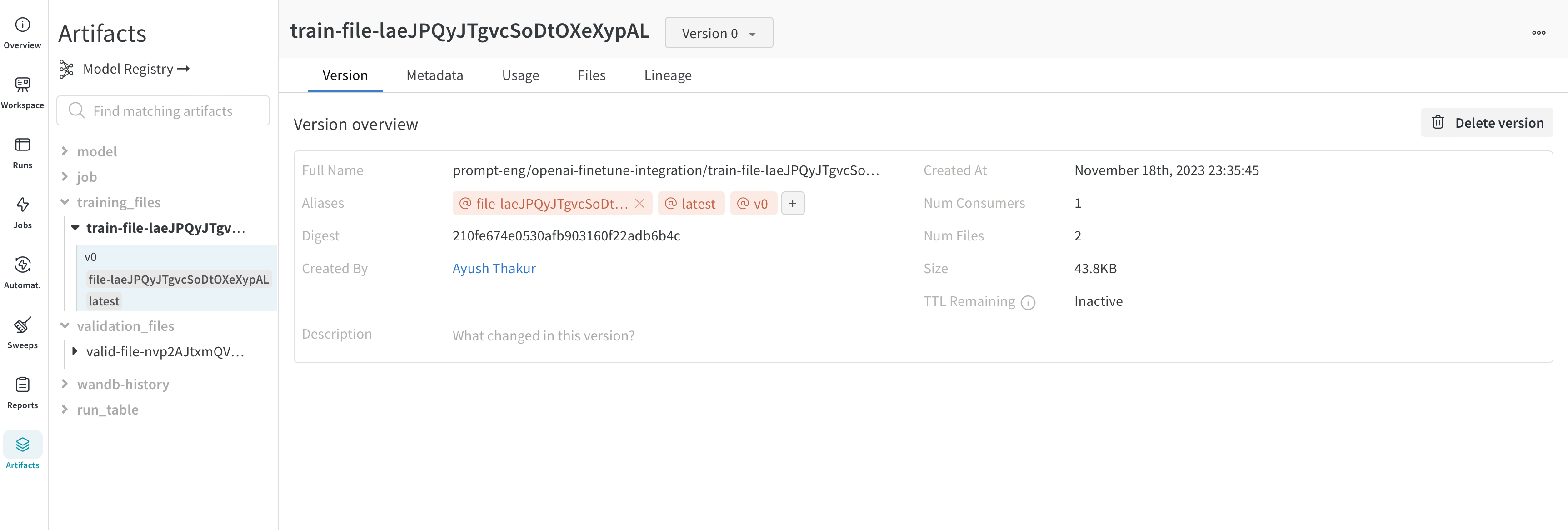 트레이닝 및 검증 Data는 자동으로 W&B에 Artifacts로 기록됩니다. 파인튜닝된 Model의 ID를 포함한 메타데이터도 Artifacts로 기록됩니다.