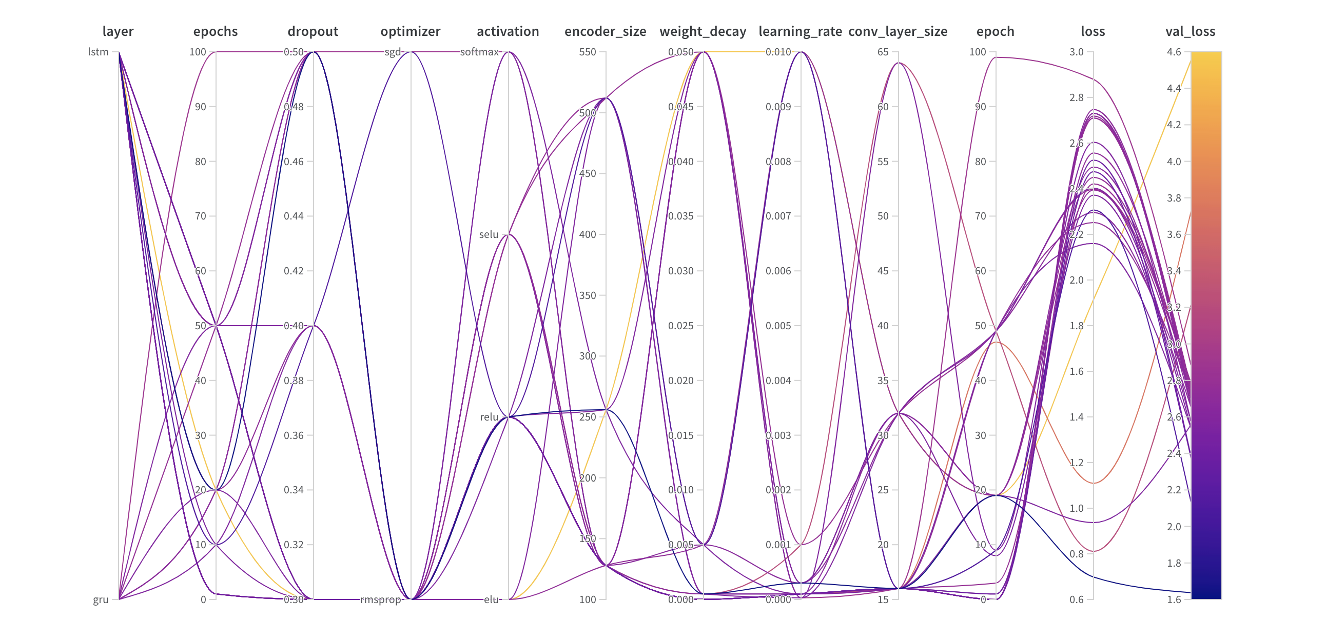 This plot maps hyperparameter values to model metrics. It’s useful for honing in on combinations of hyperparameters that led to the best model performance.